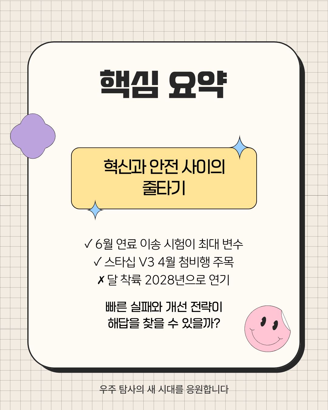 전문가들은 단기적인 일정 지연은 불가피하겠지만, 스타십이 안정화되면 우주 수송 비용을 획기적으로 낮추어 화성 탐사라는 인류의 꿈을 앞당기는 촉매제가 될 것으로 보고 있습니다.
