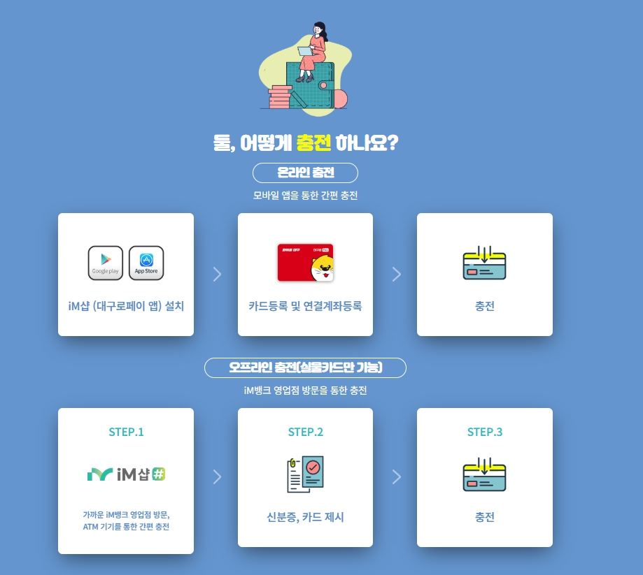 - 오프라인 충전: iM뱅크 영업점·ATM 기기에서 신분증+카드 지참