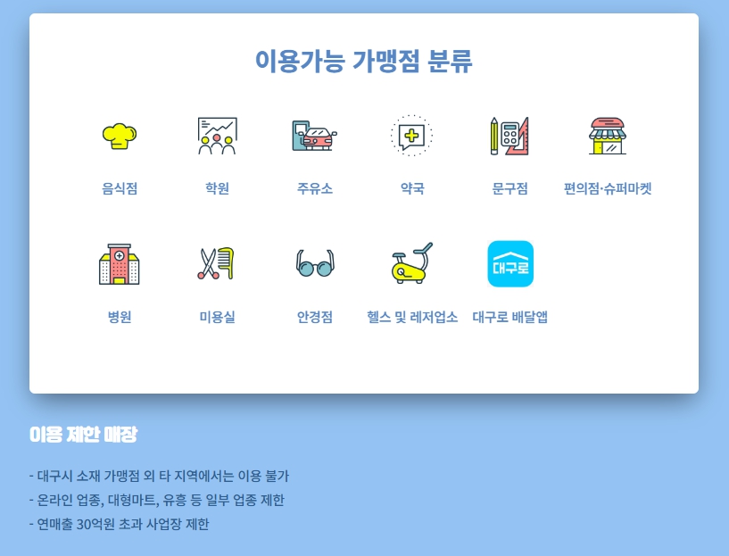 - 음식점, 편의점, 약국, 병원, 학원, 주유소, 미용실, 헬스장 등 생활밀착 업종 대부분 사용 가능