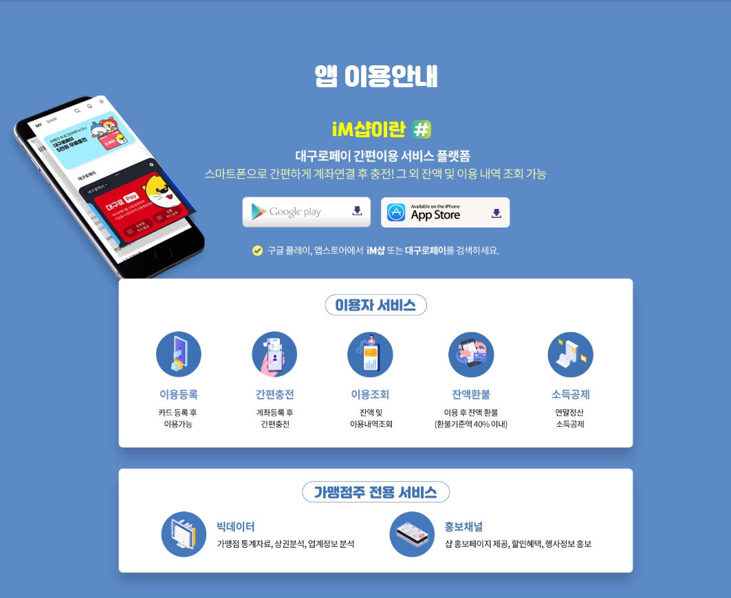 - 온라인 충전: iM샵 앱에서 계좌 연결 후 충전