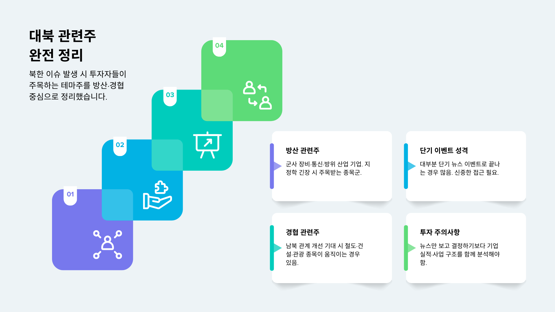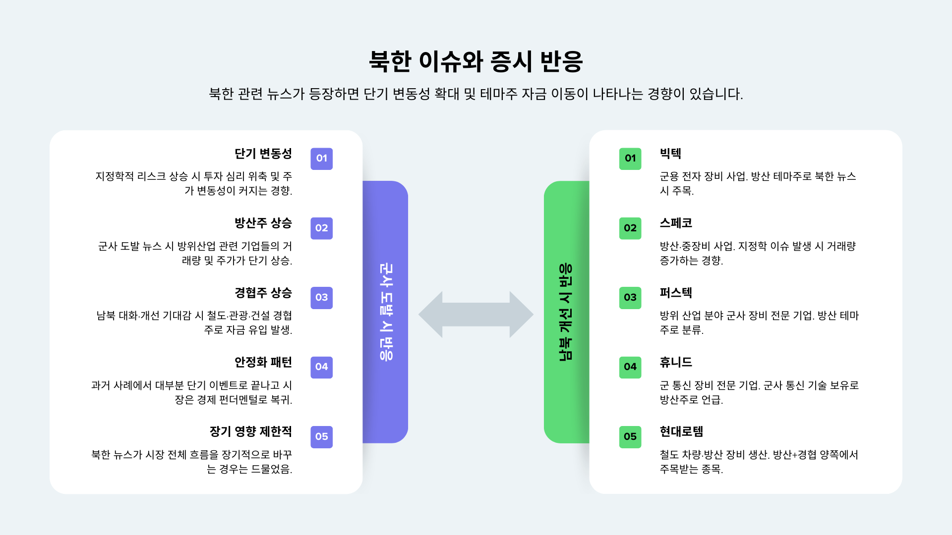 예를 들어 북한의 군사 도발이 뉴스에 등장하면 방위 산업 관련 기업들이 투자자들의 관심을 받을 수 있습니다. 반대로 남북 관계 개선 기대감이 커질 경우에는 철도, 건설, 관광 등 경협 관련 종목들이 움직이는 경우도 있습니다.