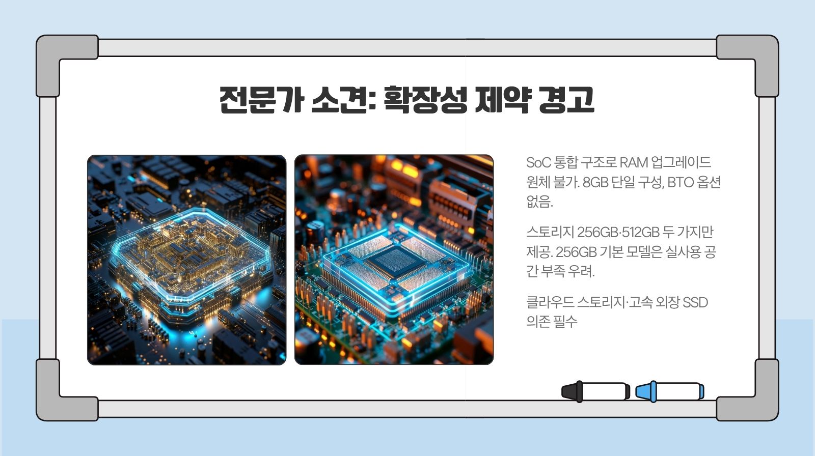 특히 256GB 기본 모델의 경우 시스템 OS와 필수 앱 설치 공간을 제외하면 실사용 공간이 턱없이 부족해질 수 있습니다. 메모리 역시 8GB 단일 구성으로, BTO(주문자 맞춤 생산)를 통한 16GB 메모리 확장 옵션조차 제공하지 않습니다. 따라서 소비자는 구매 시점부터 iCloud나 구글 드라이브 같은 클라우드 스토리지의 적극적인 활용을 업무 프로세스의 기본 전제로 설계해야 하며, 방대한 사진이나 미디어 파일 보관을 위해서는 고속 외장 SSD 의존도가 매우 높아질 수밖에 없다는 점을 분명히 인지해야 합니다