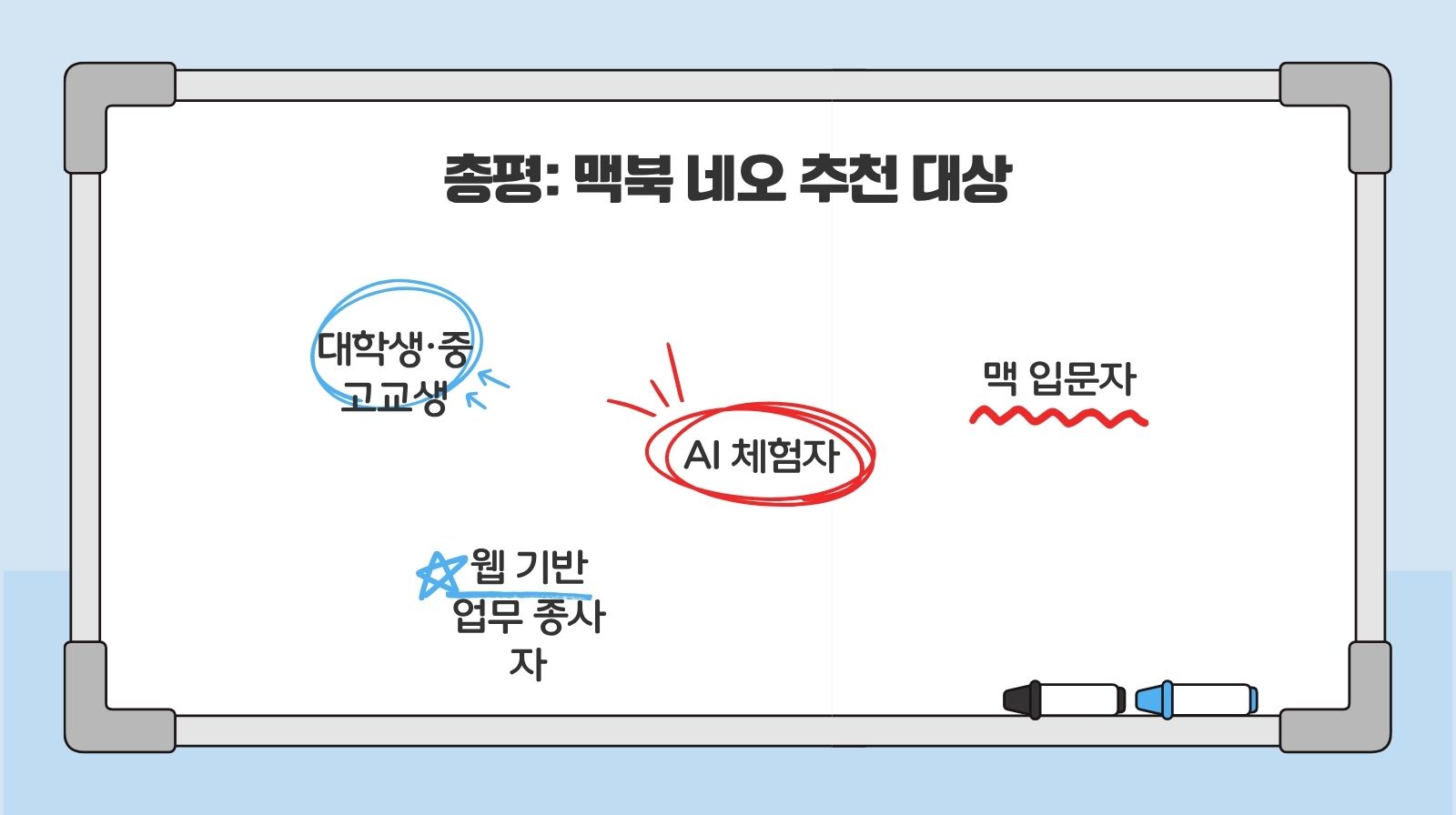 결론적으로 맥북 네오는 **"아이폰 유저를 위한 가장 완벽하고 저렴한 첫 번째 Mac"**이자, 동시에 타협점도 명확한 기기입니다. 고용량의 4K 멀티캠 영상 편집을 주업으로 하는 크리에이터나, 무거운 컴파일링을 돌리는 개발자, 고사양 스팀 게임 유저에게는 명백히 부적합합니다. 하지만 다음과 같은 목적의 사용자들에게는 비교 불가의 가성비와 만족도를 제공합니다.