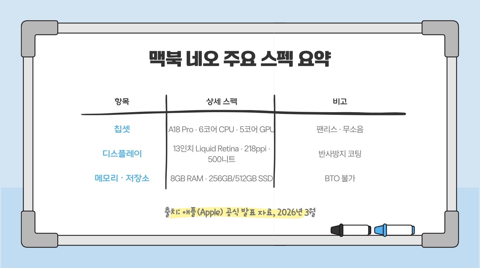 • 전략적 균형: 애플은 아이폰용 A18 Pro 칩셋을 맥에 최초로 이식하여, 99만 원이라는 파격적인 시작가와 준수한 성능의 완벽한 균형을 맞춘 '맥북 네오(MacBook Neo)'를 출시했습니다.