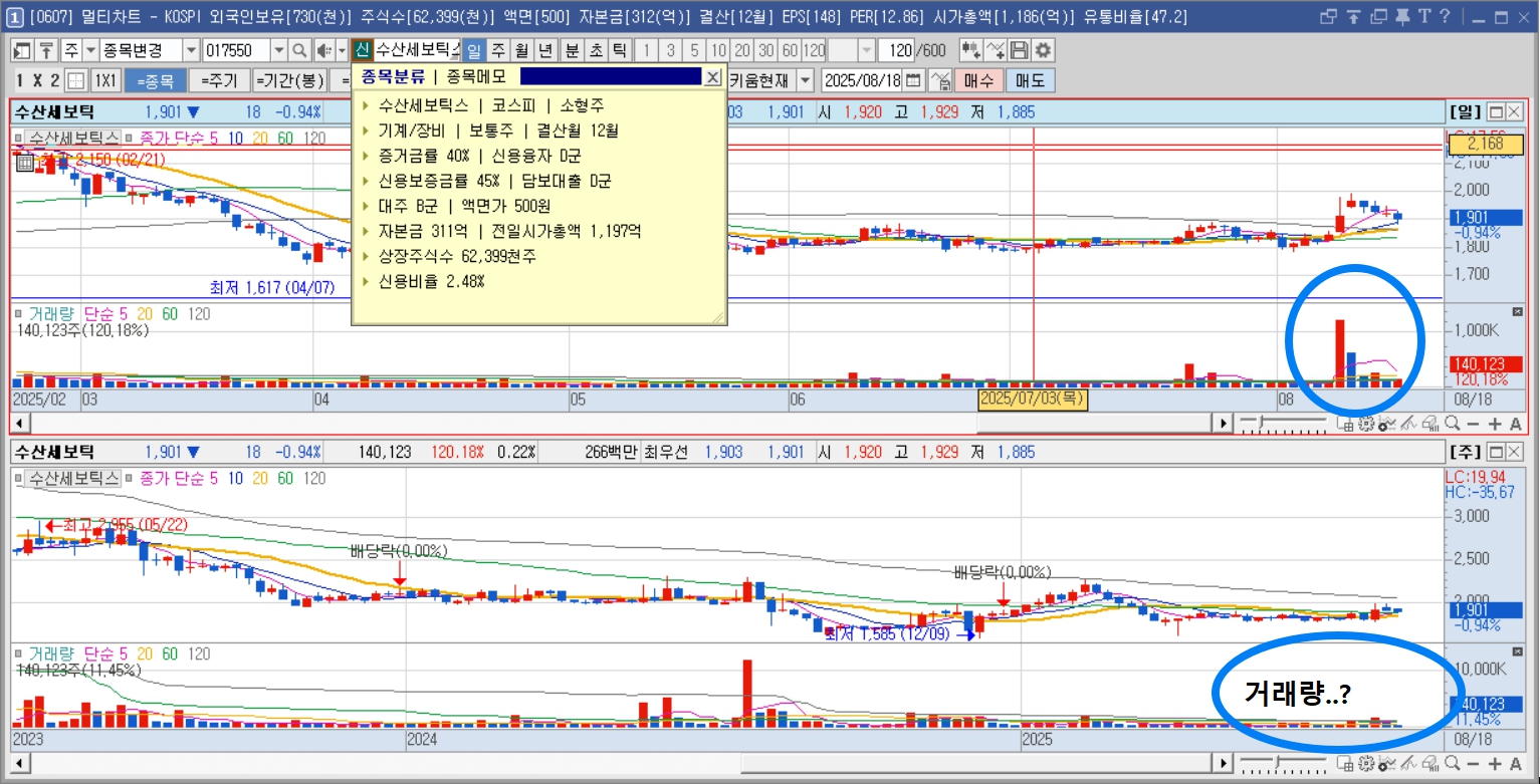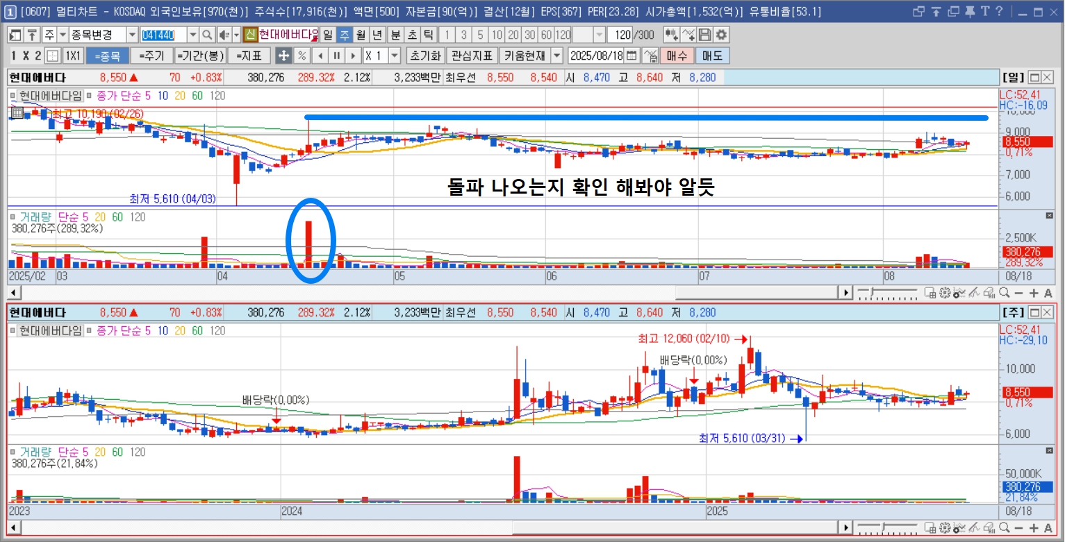 - 차트 해석: 일봉에서 거래량이 붙으며 단기 반등세. 주봉은 장기간 횡보 후 반등 시그널.