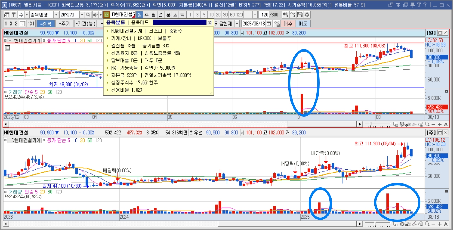 - 차트 해석: 최근 11만 원 돌파 후 조정, 주봉 기준 거래량이 실리며 추세 전환 신호.