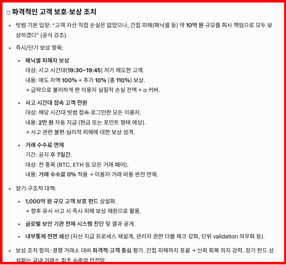 빗썸은 단순 사과로 끝내지 않고 즉각적인 피해 구제책을 발표했다.