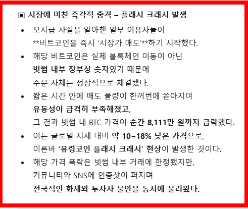 이 가격 폭락은 빗썸 내부 거래에 국한됐지만, 커뮤니티에 인증샷이 쏟아지면서 전국적 화제가 됐다.