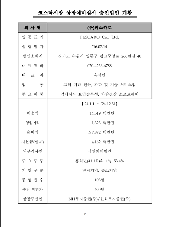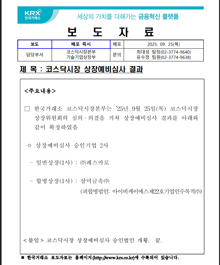 한국거래소 코스닥시장본부는 2025년 9월 25일, 두 기업의 상장예비심사 승인 결과를 발표했습니다. 이번 승인 기업은 ㈜페스카로(일반상장)와 삼미금속㈜(IBKS제22호SPAC과의 합병상장)입니다.