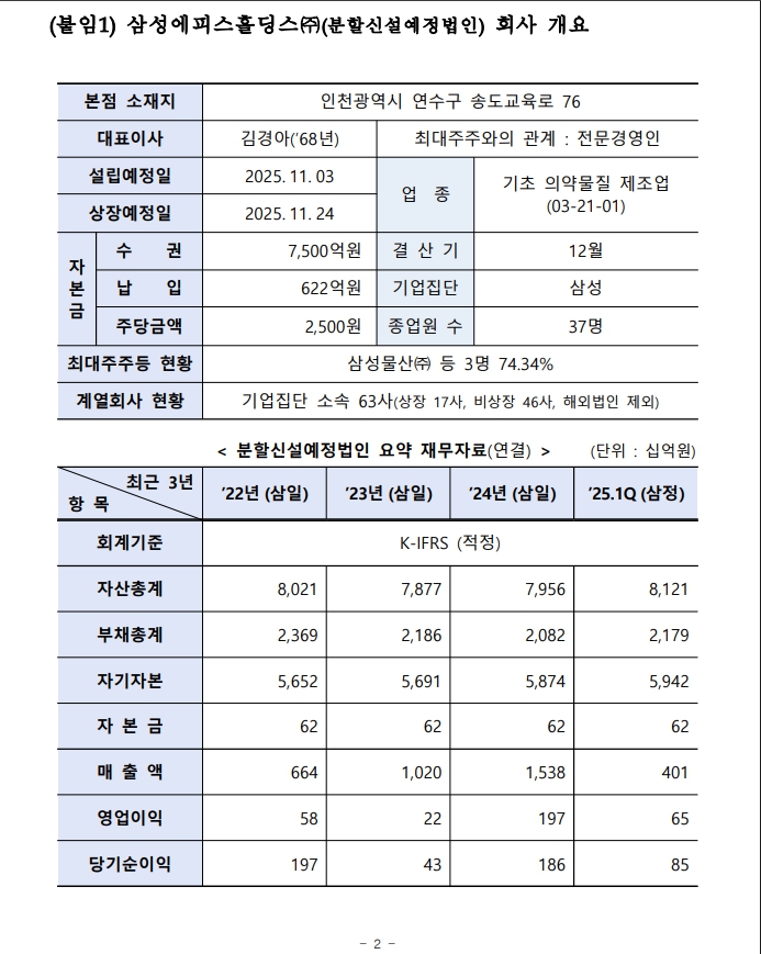 삼성바이오로직스가 자회사 관리 및 신규 투자 사업 부문을 분할해 삼성에피스홀딩스㈜(가칭)를 설립하고, 오는 2025년 11월 24일 유가증권시장에 재상장할 예정입니다.