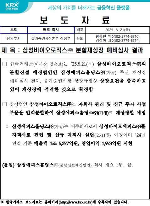 삼성바이오로직스가 자회사 관리 및 신규 투자 사업 부문을 분할해 삼성에피스홀딩스㈜(가칭)를 설립하고, 오는 2025년 11월 24일 유가증권시장에 재상장할 예정입니다.