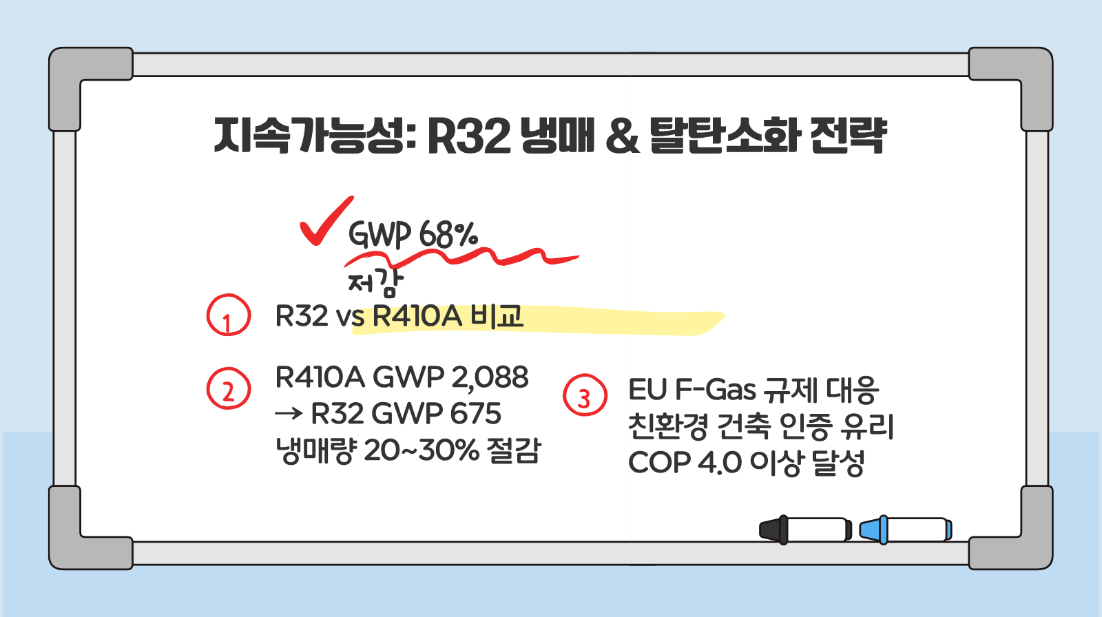 삼성전자의 최신 EHS(Eco Heating System) 히트펌프 라인업은 차세대 친환경 냉매인 R32를 전면 채택했습니다. 기존에 널리 사용되던 R410A 냉매의 GWP가 약 2,088에 달하는 반면, R32의 GWP는 675로 무려 68%가량 낮습니다.