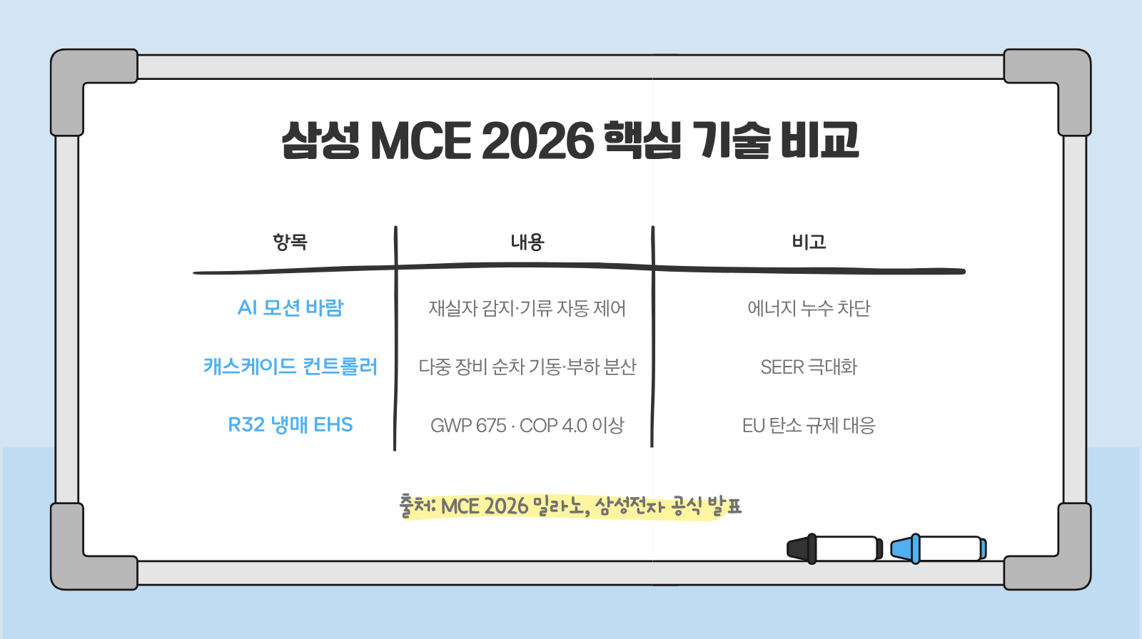 - 삼성전자는 이탈리아 밀라노 MCE 2026에서 8개 분야 우수상을 석권하며 글로벌 HVAC(냉난방공조) 시장에서의 독보적인 기술 경쟁력을 입증했습니다.