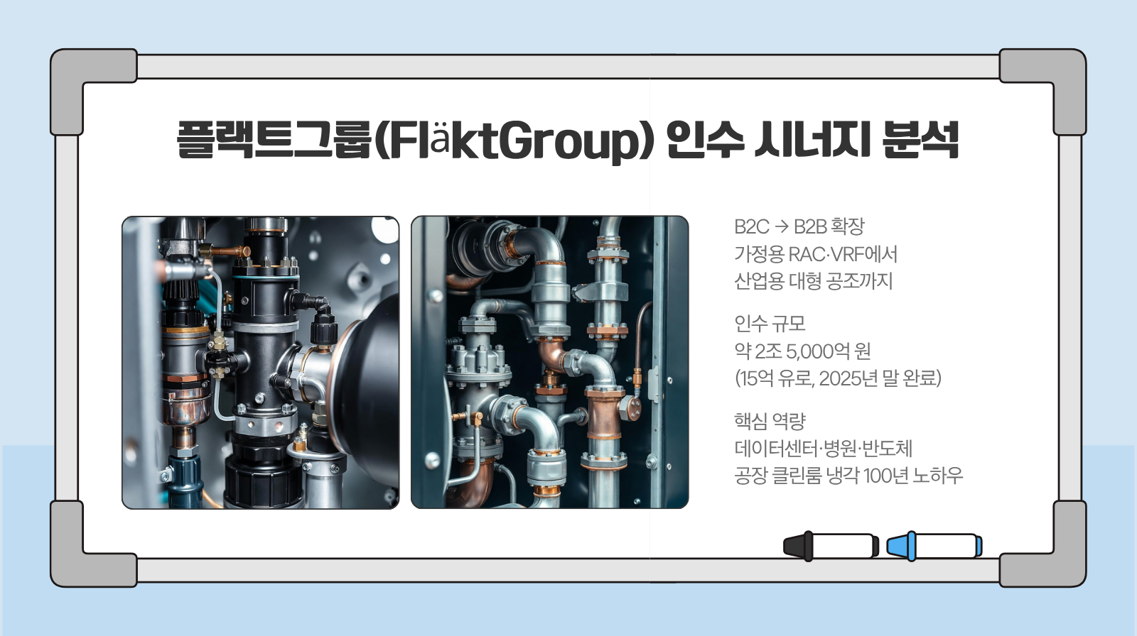 기존 삼성전자의 강점이 가정용 에어컨(RAC) 및 중소형 시스템 에어컨(VRF)에 집중되어 있었다면, 플랙트그룹은 데이터센터 정밀 냉각, 병원 및 반도체 공장의 클린룸, 대형 상업 시설의 중앙 공조(AHU) 분야에서 100년 이상의 축적된 노하우를 보유하고 있습니다. 삼성은 플랙트의 거대한 유럽 내 영업망과 산업용 장비 라인업을 단숨에 흡수함으로써, 초소형 주거 공간부터 기가팩토리급 초대형 산업 시설까지 아우르는 **'Full Line-up HVAC 솔루션 프로바이더'**로 거듭났습니다.