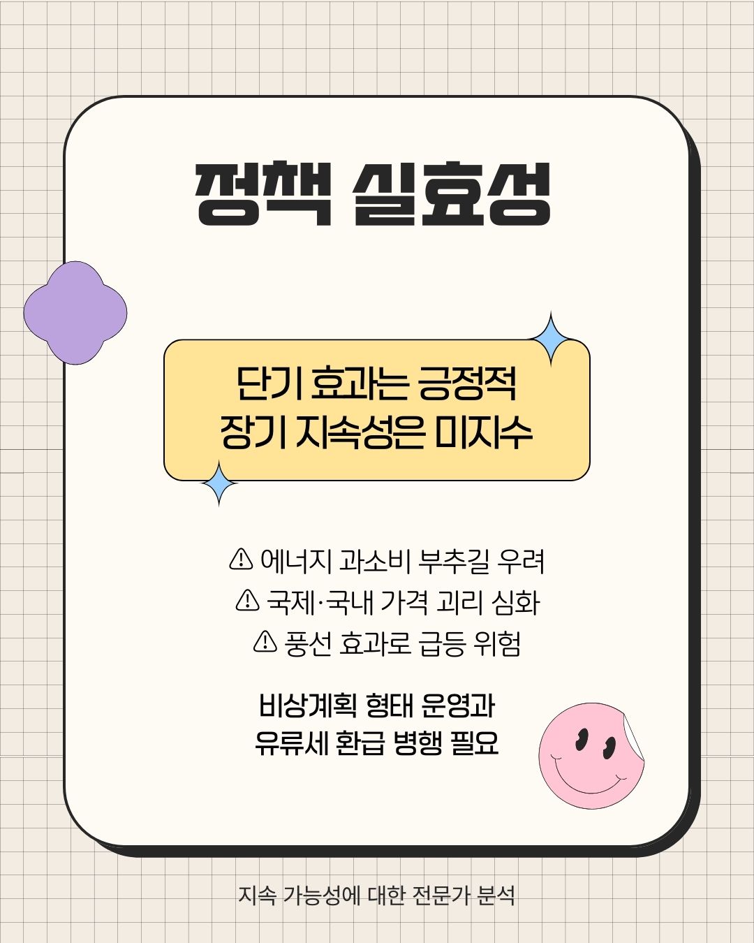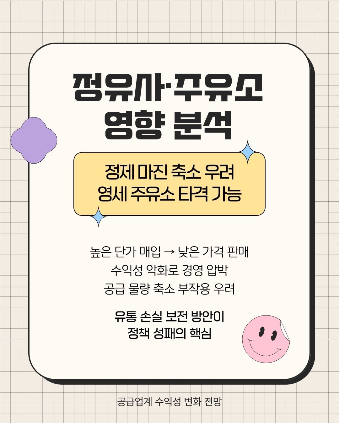 - 정유사 및 주유소 측면: 공급업계의 입장은 다소 복잡합니다. 국제 유가는 높은 수준인데 국내 판매가만 억제될 경우, 정유사의 정제 마진이 축소될 수 있습니다. 특히 영세한 자영 주유소의 경우, 높은 단가에 매입한 재고를 낮은 최고가에 맞춰 판매해야 하는 상황이 발생하면 수익성 악화로 이어질 우려가 있습니다. 이는 장기적으로 공급 물량 축소나 서비스 질 저하라는 부작용으로 이어질 가능성도 배제할 수 없습니다.