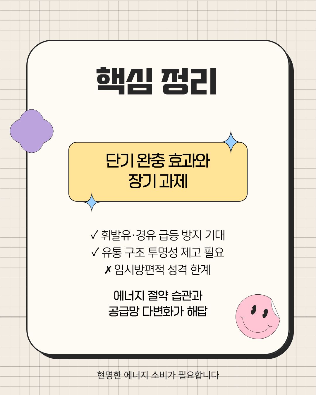 따라서 정부는 최고가격제를 상시 운영하기보다는 특정 임계치를 넘었을 때만 발동하는 '컨틴전시 플랜(비상계획)' 형태로 운영할 가능성이 높습니다. 또한, 유류세 환급이나 보조금 지급과 같은 유연한 정책과 병행하여 시장의 충격을 최소화하는 전략이 요구됩니다.