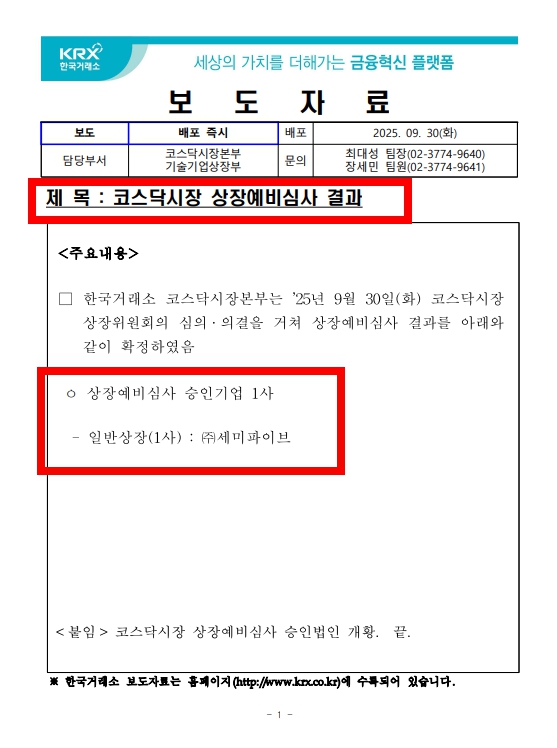 세미파이브는 2025년 9월 30일, 한국거래소 코스닥시장본부로부터 코스닥 상장예비심사 승인을 통과했습니다.