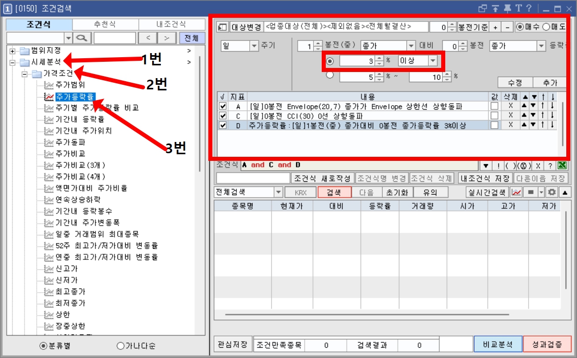 이 조건식은 강한 단기 상승 신호를 포착하는 데 초점을 맞췄으며,