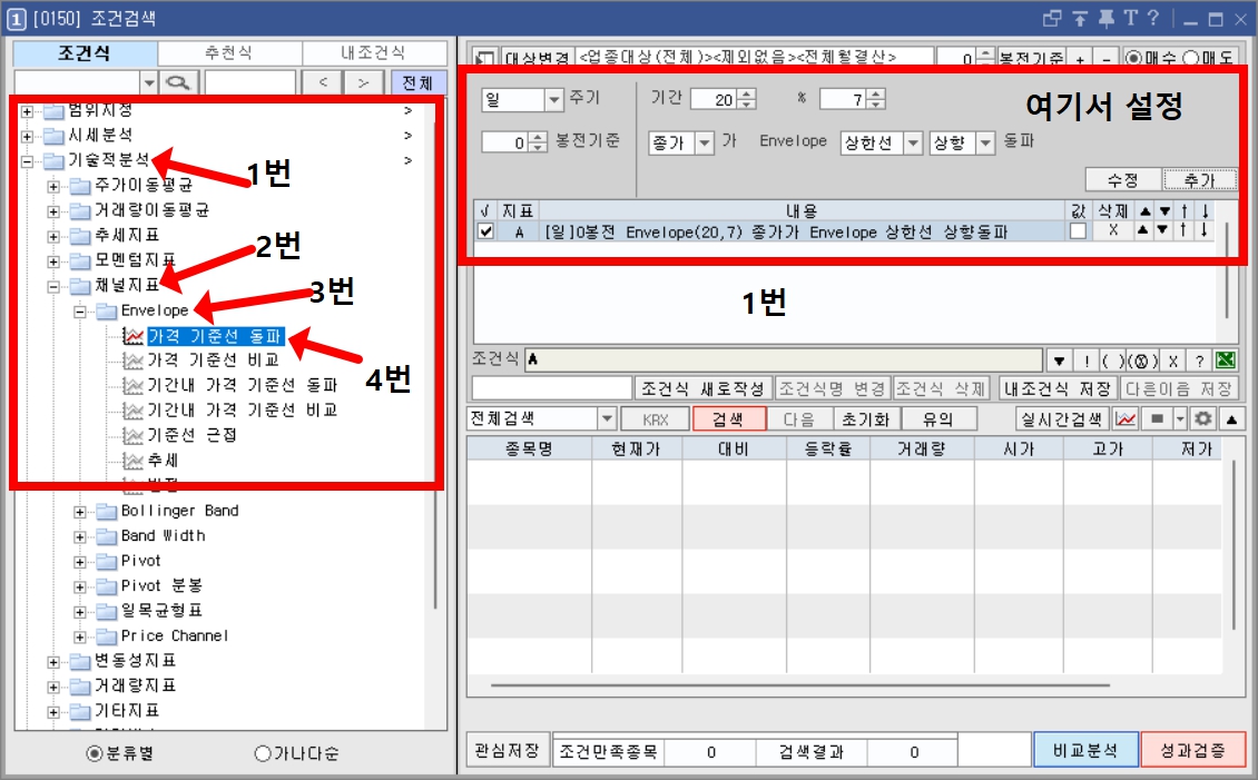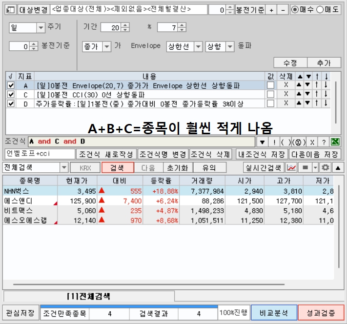 엔벨로프(Envelope) + CCI 지표 + 당일 변동성 조건을 조합한 검색식을 소개합니다.