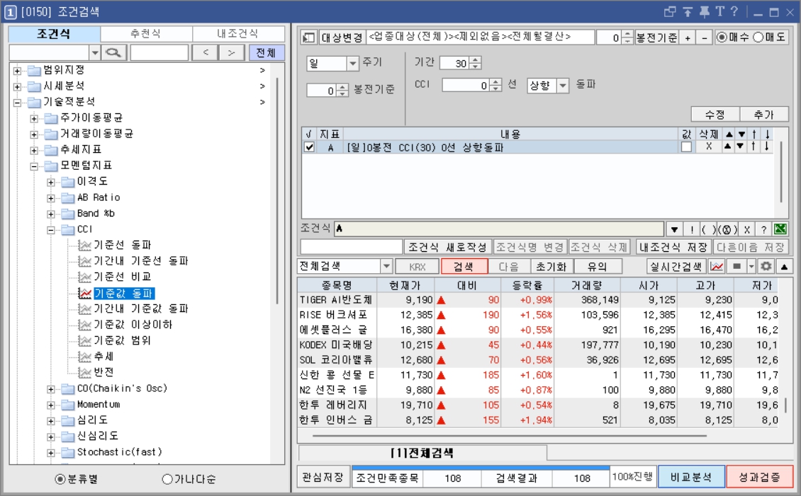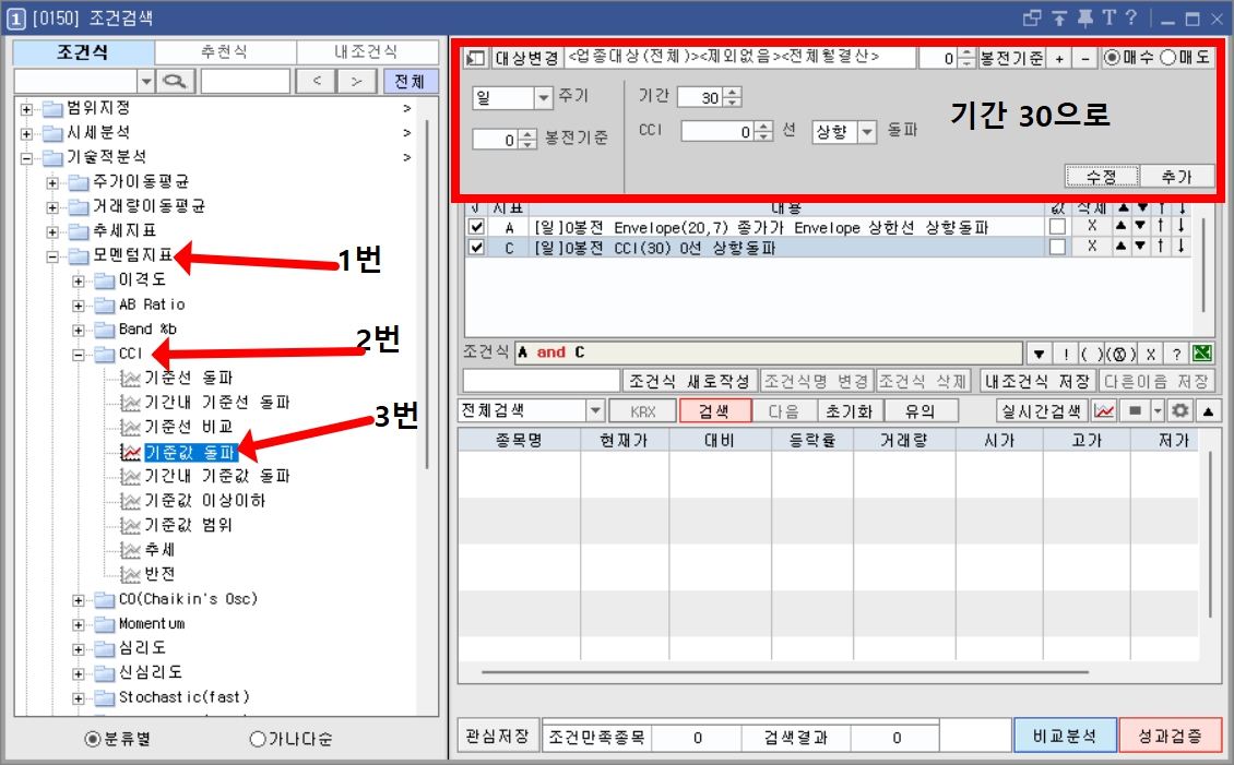 - 조건: 0봉전 CCI(30) 0선 상향돌파