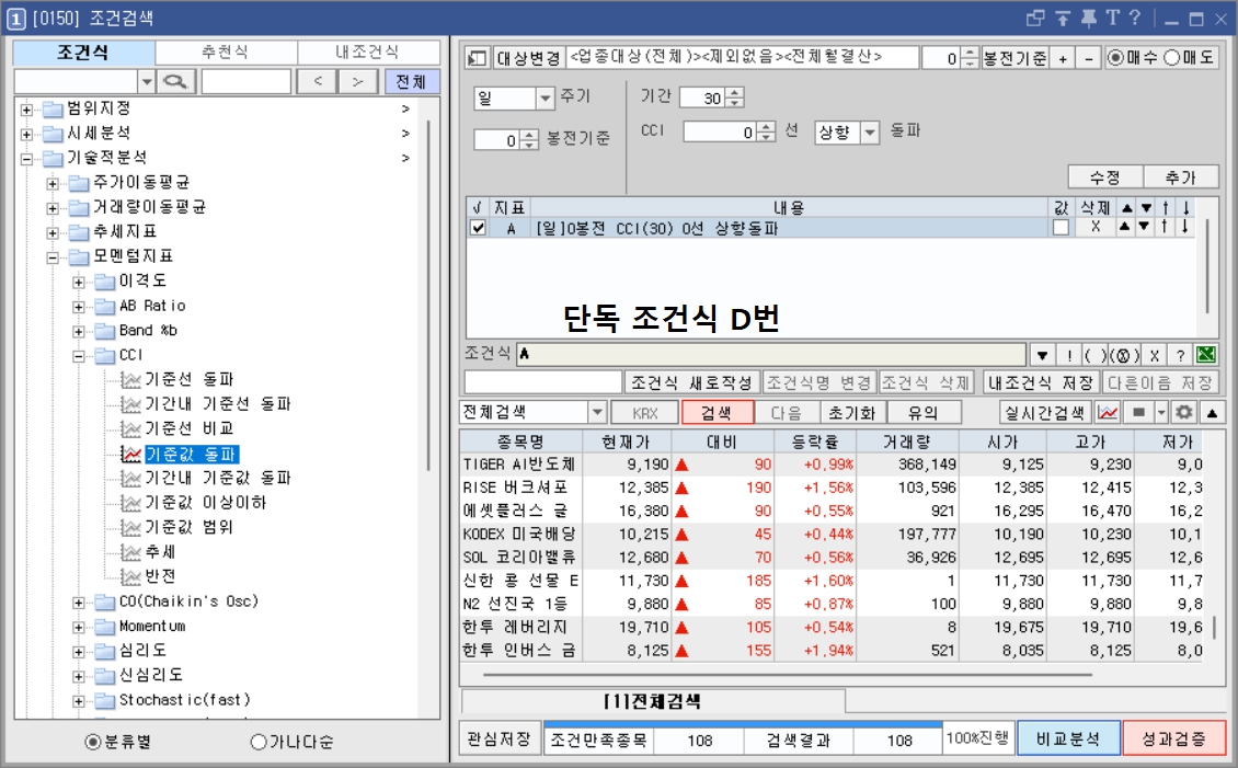 - D: CCI(30) 기준선 상향돌파 (단독 조건)