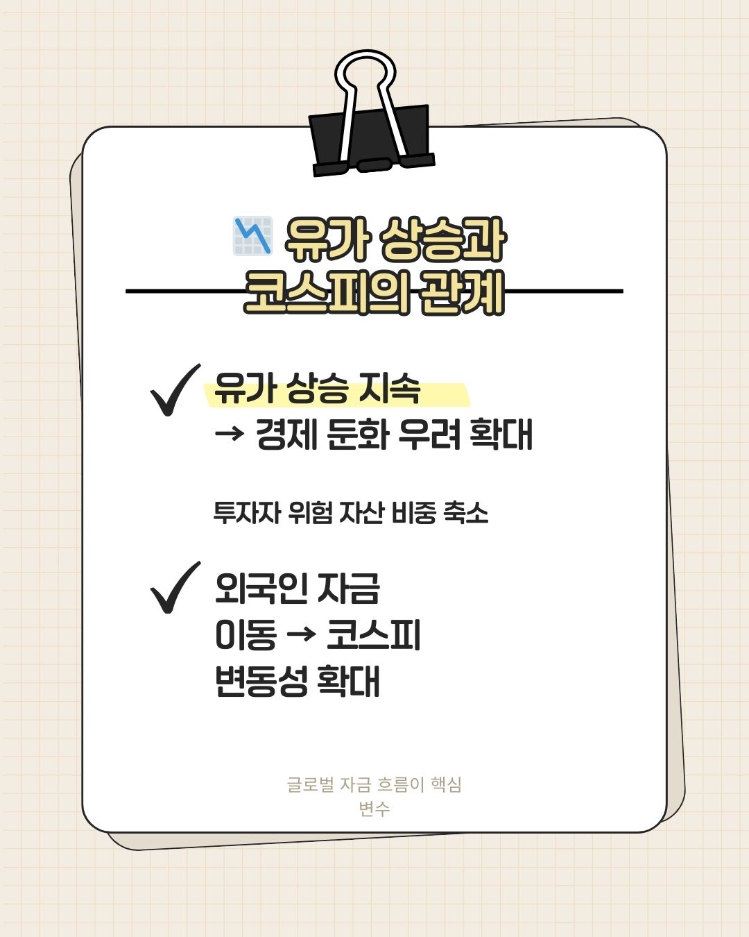 최근 뉴스에서도 유가 상승이 코스피 하락 요인 중 하나로 언급되는 이유가 바로 이러한 글로벌 자금 흐름과 연결되어 있기 때문입니다.