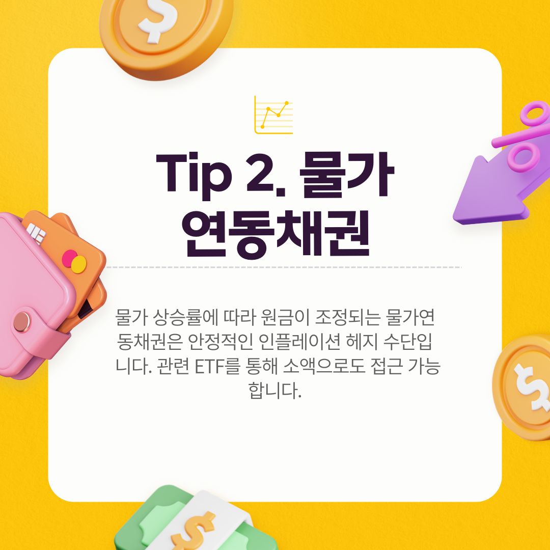 한국에서도 물가연동국채가 발행되어 있으며, 소액 투자자라면 관련 ETF를 통해 간접적으로 접근할 수 있습니다. 변동성이 낮고 안정적인 자산을 원하는 투자자에게 적합한 선택지입니다.