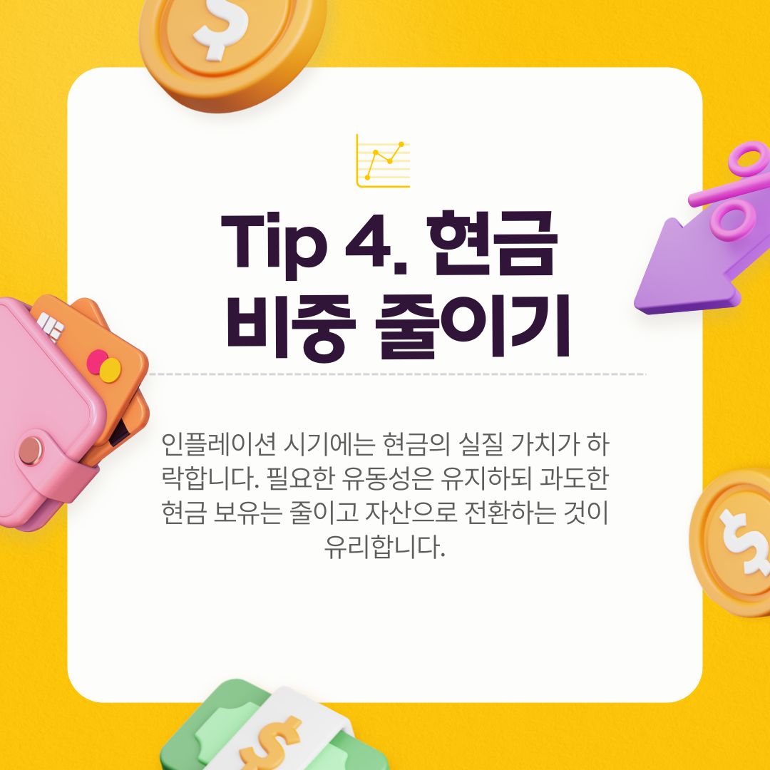 반대로 현금이나 요구불 예금처럼 이자율이 물가 상승률을 따라가지 못하는 자산은 실질 가치가 하락합니다. 필요한 유동성은 유지하되, 과도한 현금 보유는 인플레이션 시기에 손실로 이어질 수 있다는 점을 인식해야 합니다.
