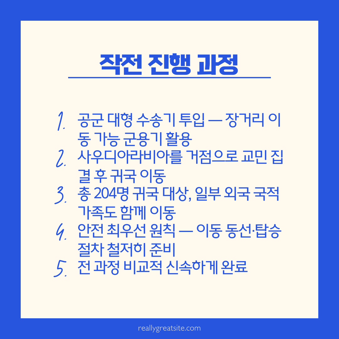 정부는 사우디아라비아 지역을 중심으로 교민들을 집결시키고 군 수송기를 통해 한국으로 이동하는 계획을 세웠다. 이 과정에서 총 204명의 한국인이 귀국 대상에 포함됐으며, 일부 외국 국적 가족들도 함께 이동한 것으로 알려졌다.