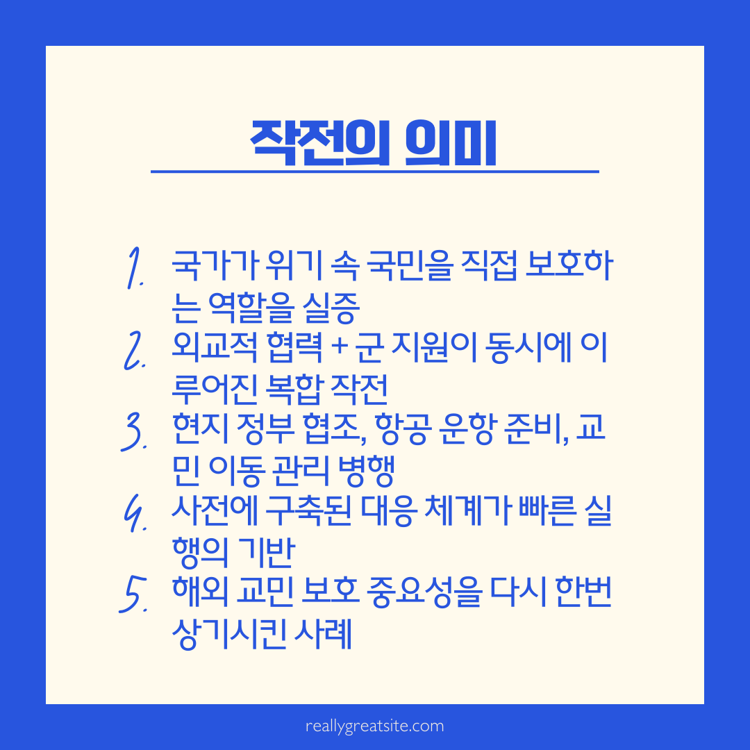 또한 이러한 작전은 외교적 협력과 군의 지원이 함께 이루어져야 가능하다. 현지 정부와의 협조, 항공 운항 준비, 교민 이동 관리 등 다양한 요소가 동시에 진행되기 때문이다.