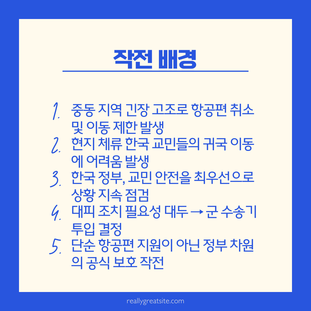 한국 정부는 교민 안전을 최우선으로 고려해 상황을 지속적으로 점검했고, 필요할 경우 대피 조치를 준비해왔다. 그 결과 실행된 것이 바로 작전명 사막의 빛 한국인 대피 작전이다. 이 작전은 단순한 항공편 지원이 아니라 군 수송기를 활용한 정부 차원의 보호 조치라는 점에서 의미가 있다.