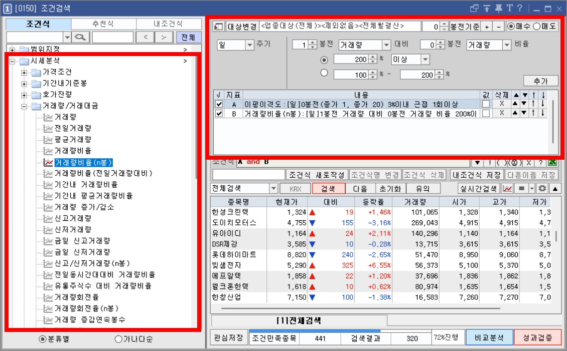 시세분석 > 거래량/거래대금 > 거래량비율(n봉) - 조건: