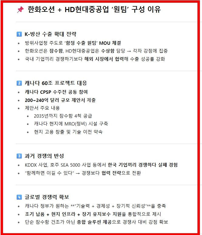 이 거대한 수주전에서 한화오션은 HD현대중공업과 ‘원팀’을 구성해 입찰에 참여했습니다. 두 회사는 잠수함 건조 경험과 글로벌 조선 역량을 합쳐, 캐나다 정부가 요구하는 기술력·가격 경쟁력·장기 유지보수 능력을 충족할 수 있다는 점을 강조하고 있습니다.