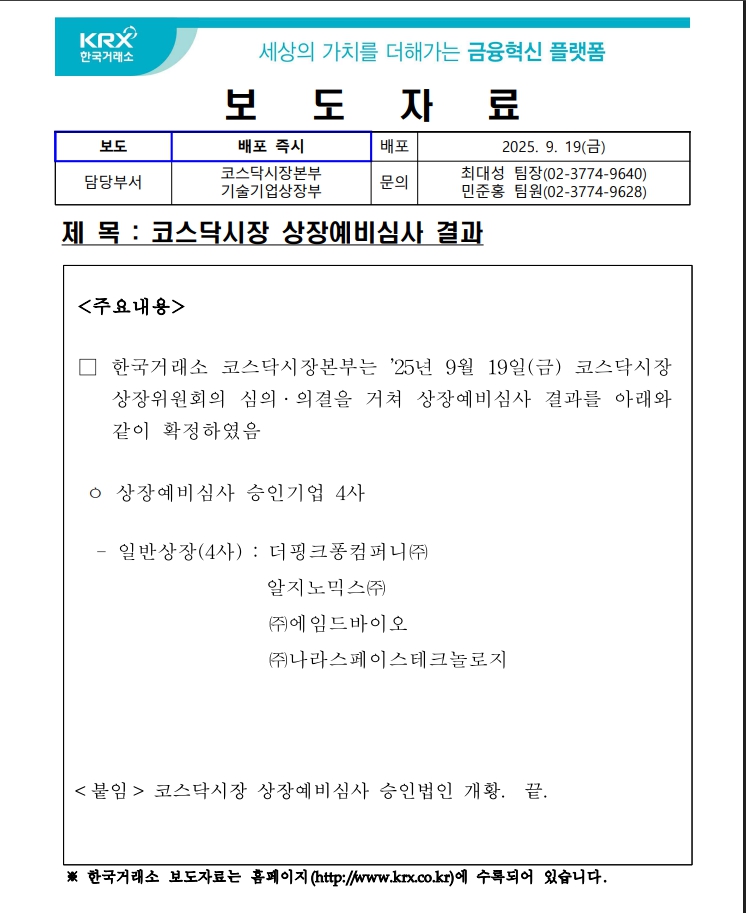 최근 한국거래소가 발표한 코스닥 상장예비심사 결과가 시장에 새로운 활기를 불어넣고 있습니다. 이번 심사에서는 더핑크퐁컴퍼니, 알지노믹스, 에임드바이오, 나라스페이스테크놀로지 등 4개 기업이 승인을 받았는데요. 각기 다른 영역에서 성장 스토리를 가진 기업들이 상장 무대에 오를 준비를 하고 있다는 점에서 투자자들의 관심이 집중되고 있습니다.