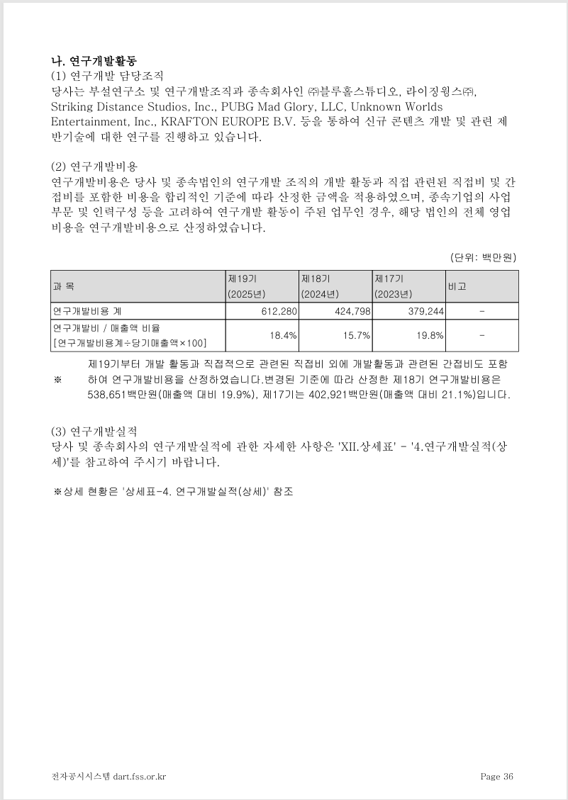 2025년 연구개발비용은 6,122억 원(매출의 18.4%)으로 전년(4,247억) 대비 44.1% 증가했습니다. inZOI 추가 개발, 배틀그라운드 신규 콘텐츠, 미출시 신작 프로젝트 투자가 주된 이유입니다.