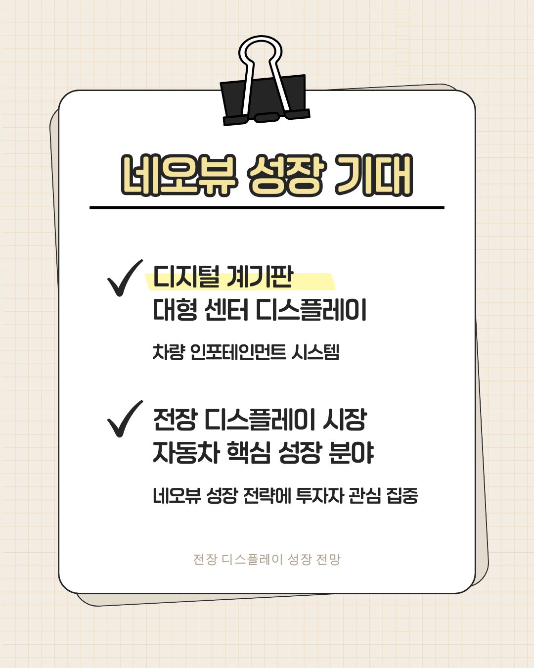 만약 네오뷰가 이러한 전장 디스플레이 사업을 중심으로 성장 전략을 펼친다면 투자자들의 관심이 더욱 높아질 가능성이 있습니다.