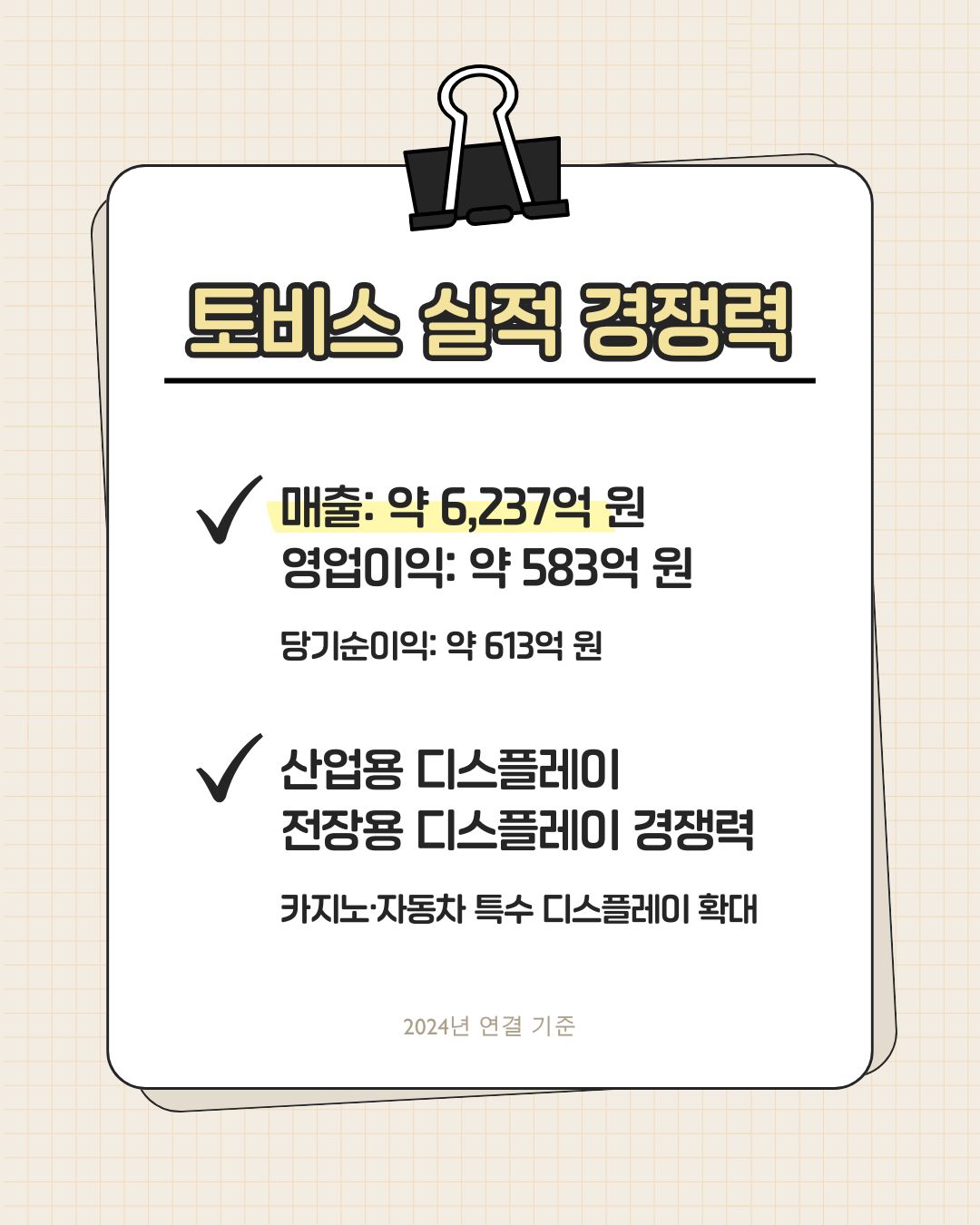 특히 토비스는 산업용 디스플레이와 전장용 디스플레이 분야에서 경쟁력을 가진 기업으로 평가받고 있습니다.