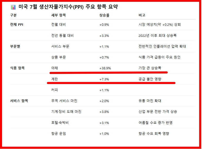 최근 발표된 7월 미국 PPI는 전월 대비 +0.9%, 전년 동월 대비 **+3.3%**로 나타났습니다. 이는 시장 예상치(약 +0.2%)를 크게 상회하는 수준으로, 2022년 이후 가장 큰 상승폭입니다. 특히 서비스 부문이 +1.1%, 상품 부문은 +0.7% 상승했으며, 식품 항목에서는 야채 가격 +38.9%, 계란 +7.3%, 커피 +1.1% 등의 급등세가 확인되었습니다.