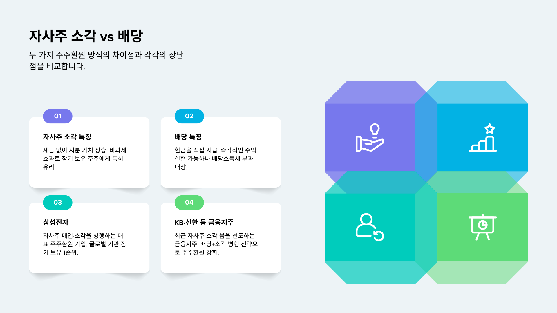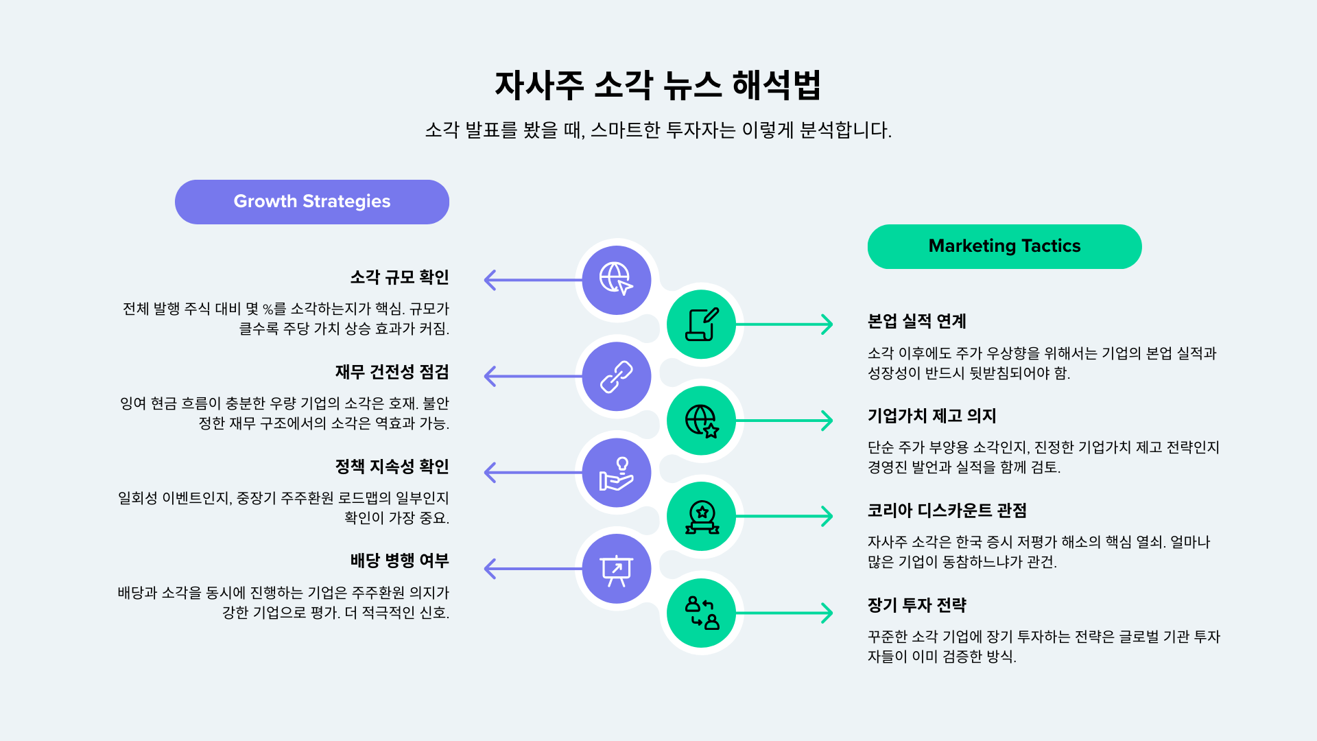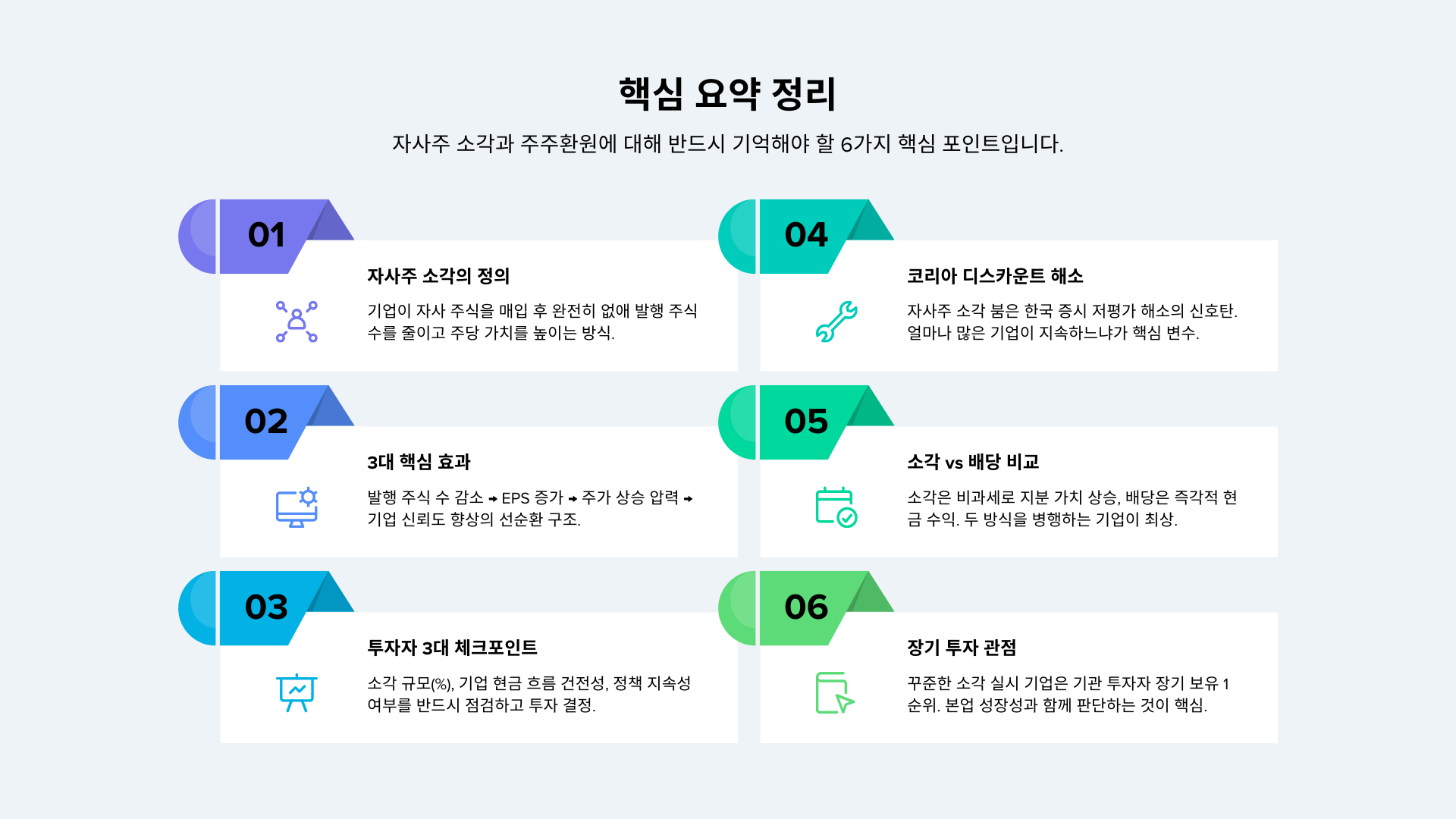 - 강력한 주가 하방 경직성 확보: 기업의 자사주 매입 자체가 거대한 매수 대기세력으로 작용하여 주가 하락을 방어하고 안정시킵니다.