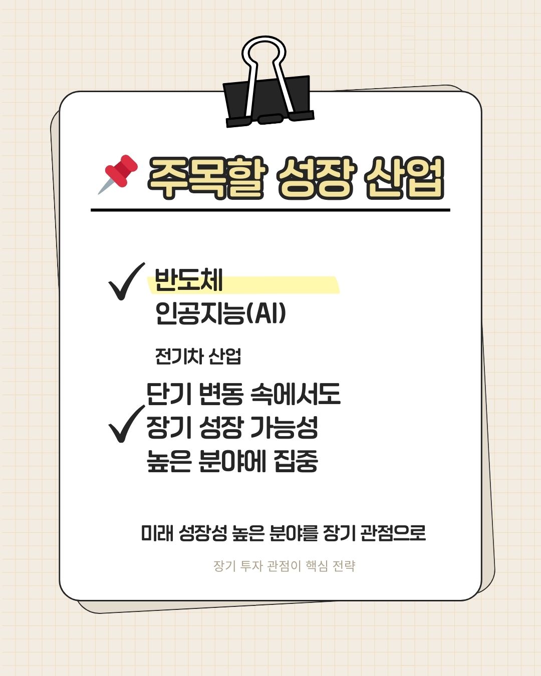 또한 장기적인 관점에서 성장 가능성이 높은 산업이나 기업에 집중하는 것도 중요한 전략입니다. 반도체, 인공지능, 전기차 산업처럼 미래 성장성이 높은 분야는 단기적인 시장 변동 속에서도 장기적인 성장 가능성이 높기 때문입니다.