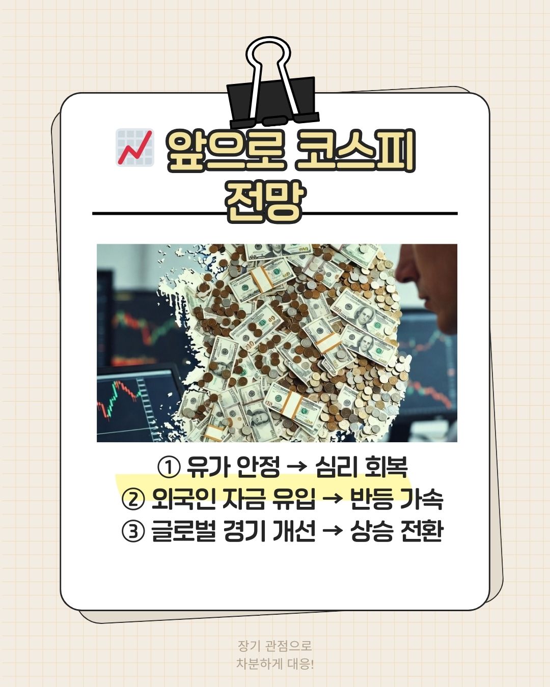 만약 국제 유가가 안정되고 글로벌 금융시장이 다시 안정적인 흐름을 보인다면 코스피 역시 점차 회복 흐름을 보일 가능성이 있습니다. 특히 외국인 투자자들의 자금이 다시 유입된다면 시장 반등 속도는 더욱 빨라질 수 있습니다.