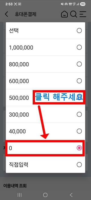 - 📷 이미지2 : 소액결제 한도 설정 화면. 여러 금액 옵션 중에서 0원을 선택합니다.