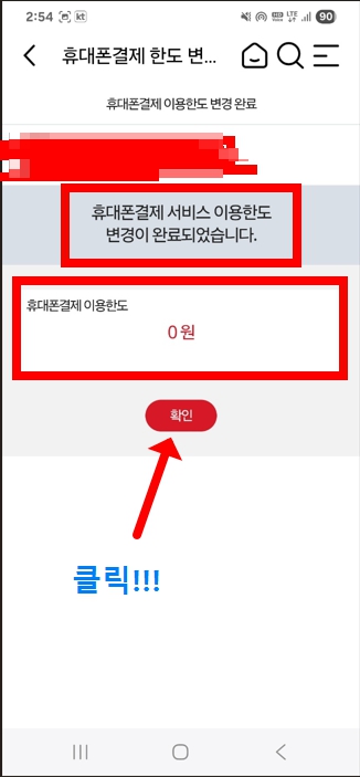 - 📷 이미지7 : 변경 완료 팝업이 뜬 모습. 이제 소액결제가 차단됩니다.